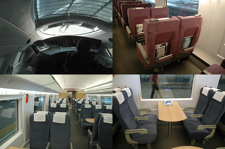 ↓(左)運転室、客室との仕切はガラス(スモーク切替式)、(右)一等座背面