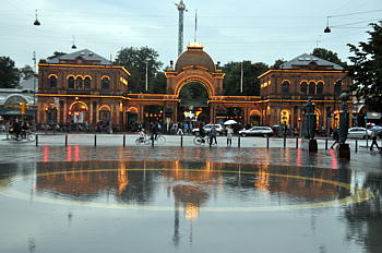 駅前には、道路を挟んでチボリ公園(遊園地)があります。道路に面して、チボリ公園外側の一角に、日本のパン屋さん「アンデルセン」コペンハーゲン2号店も出店しています。デザインはJR九州や和歌山電鉄で有名な水戸岡氏によるよる店舗です。