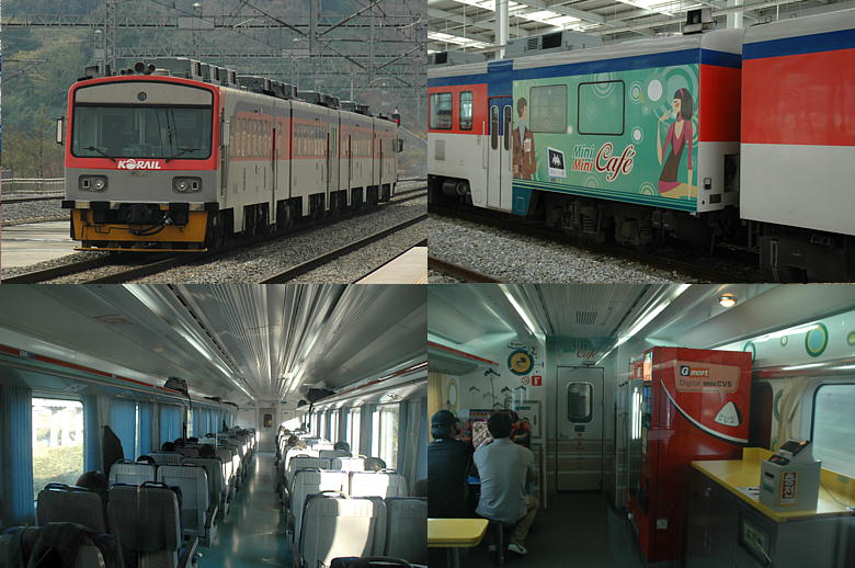 ↑(左)旧型客車(慶州)、(右)旧型客車内(慶州)