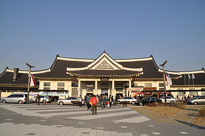 全羅北道の中心で百済時代の都の都市。駅舎は屋根の立派な寺社風。KTXを含めは全列車停車する。中心部からはタクシーで10分ほど離れている。家族会館というお店のピビンバは1000円もしない値段でおかずが15品程度付いてくる豪華バージョンでおすすめ。
