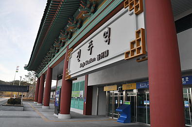 KTX慶全線2期開業でKTXが停車するようになった駅で、古都晋州の入口駅。地平ホームの2面4線です。駅舎は韓国伝統の寺社風で、駅内にはコンビニがあります。