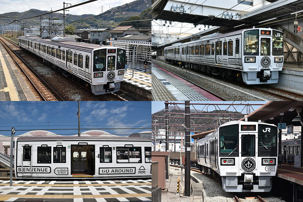 (左)サイドビュー、窓枠は列車名の旅行カバンを意味するカバンデザイン(八浜)、(右)フロントビュー(宇野)