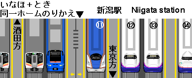 在来線の高架化により、新幹線11番線の反対側に番線のない「のりかえホーム」を増設し、酒田方面の特急いなほと新幹線を同一ホーム乗換可能になりました。11番線発着の新幹線は、両側のドアが開きます。新幹線側駅コンコースに「忠犬タマ公」像があり。
