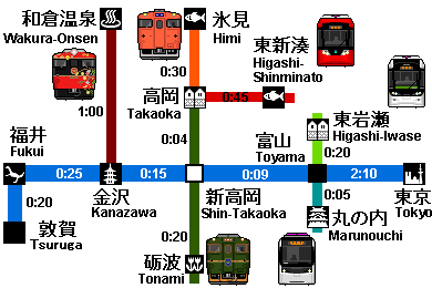 敦賀, 越前たけふ, 福井, 芦原温泉, 加賀温泉, 小松, 金沢, 新高岡, 富山, 黒部…, 糸魚川, 上越妙高, 飯山, 長野… 軽井沢… 高崎… 東京