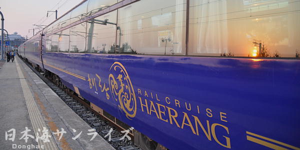 韓国の豪華クルーズ寝台列車ヘラン号。以前ソウル駅で見かけ、乗車すると決めていたヘラン号。韓国人のツアーに混じっての参加だが、クルーは日本語も話せる。朝、目が覚めると列車は日本海(東海)沿いの駅に停車していた。ここで日の出の鑑賞タイム。ブルーの車体に朝日が反射していた。