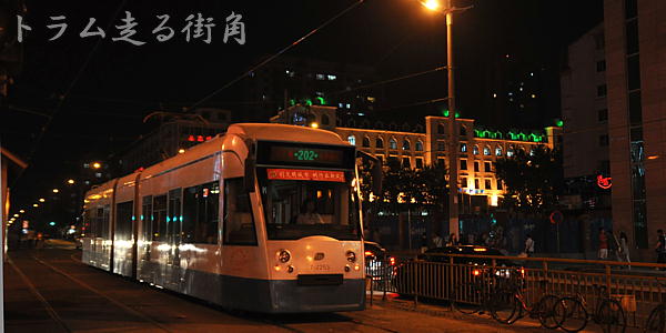 満鉄の面影や上野駅風の大連駅など見所が多い大連。大連駅前を通る系統には日本時代の路面電車が今も、吊り掛け音を唸らせて駆けめぐっている。ツアーの観光から開放された夕食後に、旧型路面電車に乗り、終点までやってきた。ここでLRV型のみが走る系統を眺める。中国らしいカラフルなライトアップと欧州式LRVが結構似合っていた。