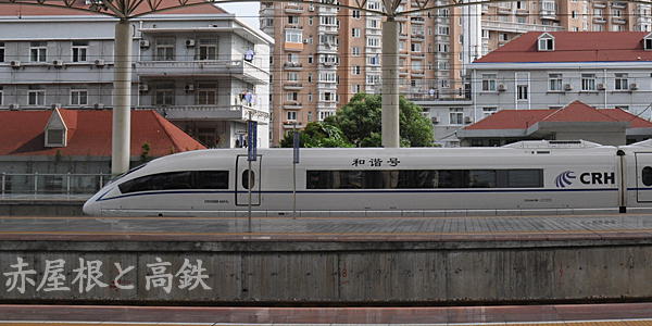 赤い屋根の家が目立つ上海南駅にCRH380Bが停車している。高速鉄道の大半は上海虹橋駅発着だが都心直結のこちらの路線は本数が少ないものの便利。終点の上海駅まではあと少し。